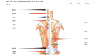 MUSCLE TENSION - Surface electromyography (semg) is performed to determine areas of ABNORMAL muscle imbalance and tension. This test measures the level of electrical activity in your back and neck muscles. Significant areas OF ABNORMAL TONE are identified in color on the report. Tension and muscle imbalances may be caused by spinal subluxations. The sEMG test provides objective measurements that assist your chiropractor in determining how subluxations are affecting your health.
